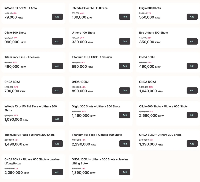 Skinvive, Radiesse, Waterglow Injection, Rejuran Healer, Q-Facial, LDM, Waterdrop Lifting Peel, Mall DM.Cell, Skin Plus Ampoule, Exosome (G-MPF), Lilied M, Juvelook, Chanel Injection, Aqua Shine BTX, Vital Injector 2, Dermashine Balance, Skinbooster Pro, Shining Peel, Oxygen Dome Facial, LED Light Therapy, Calming Care Facial, Hydration Infusion Therapy, Brightening Facial, Sebum Control Facial, Pore Tightening Booster, Moisture Glow Shot, Glutathione IV, Vitamin C Drip, Anti-aging Cocktail Drip, MTS + Ampoule Facial, Gua Sha Facial, High-Frequency Facial, Acne Peel, Enzyme Peel, Milk Peel, Mandeli Clear Peel, Salmon DNA Booster, PolyNucleotide Therapy, 5GF Ampoule Therapy